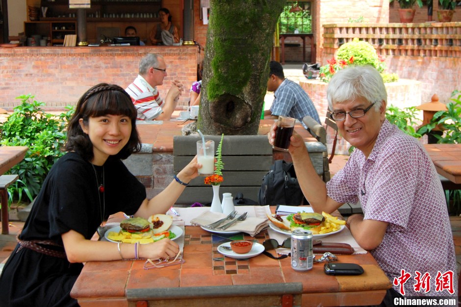 蔡韵曾在文章中表示:“要做120分的梦,寻找所有可能性。即使最后只拿到90分,也比圆满完成50分的目标美好。”大三期间,蔡韵主动申请到《尼泊尔时报》做记者,图为蔡韵与该报主编合影。(图片由受访者提供)