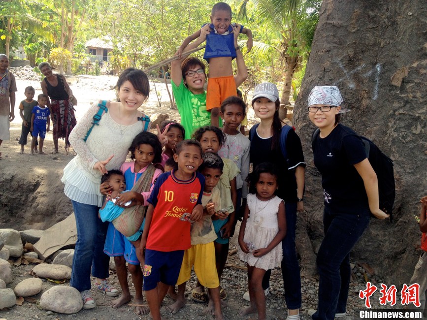 大四的这一年,东帝汶母婴生产死亡率居高不下的问题吸引了蔡韵的目光。她两度前往东帝汶,采访了上至东帝汶总统,下至接生妇的各界人士,最终完成纪录片《Moris Mai - 初生》,并在大陆、台湾、新加坡的多所影院展映。图为蔡韵在东帝汶拍摄纪录片期间与当地孩子合影。(图片由受访者提供)