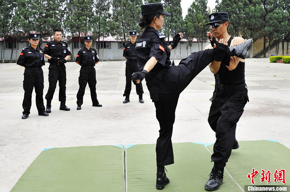 8月16日,记者走进四川省荞窝监狱,探访该狱女子特警队的工作与训练。荞窝监狱女子特警队是一支承担着荞窝监狱女子监区安全警戒、巡逻检查、应急处置和女性服刑人员外出就医及其他狱外押解等任务。图为四川省荞窝监狱女子特警在进行格斗训练。安源 摄