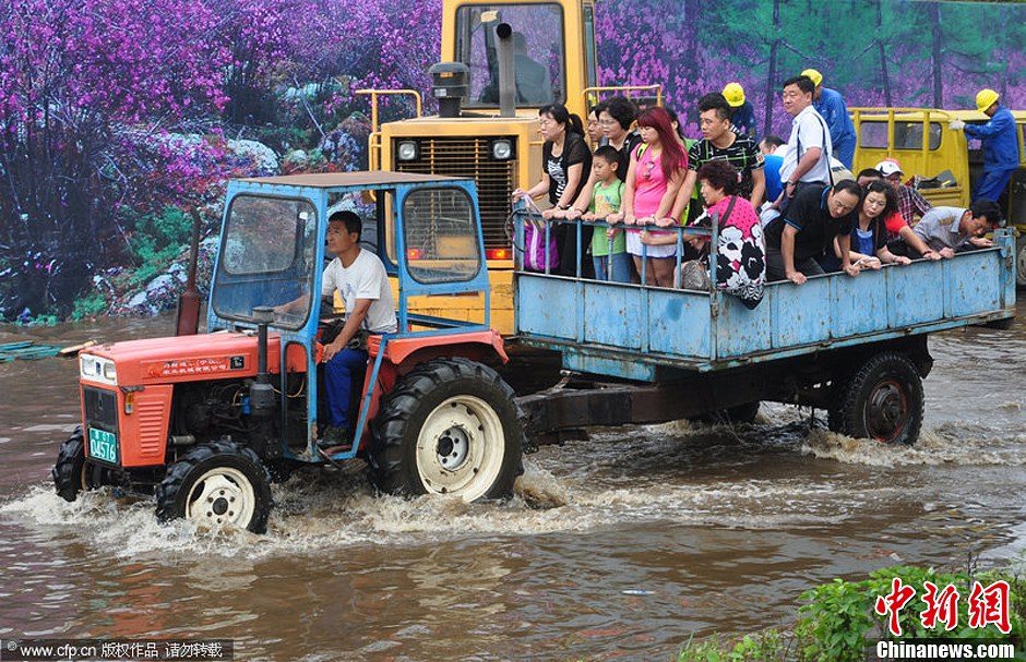 8月15日,多位网友称,伊春机场用卡车作摆渡车接送乘客。黑龙江省机场管理集团有限公司昨日回应,当天由于伊春连续强降雨,导致机场与市区交会路口大面积积水,伊春机场为保证旅客顺利成行,租用大卡车接送乘客渡过积水路段,所有航班均正点运行。图为8月15日,黑龙江伊春机场租用大卡车接送乘客渡过积水路段。张恩普 摄 图片来源:CFP视觉中国