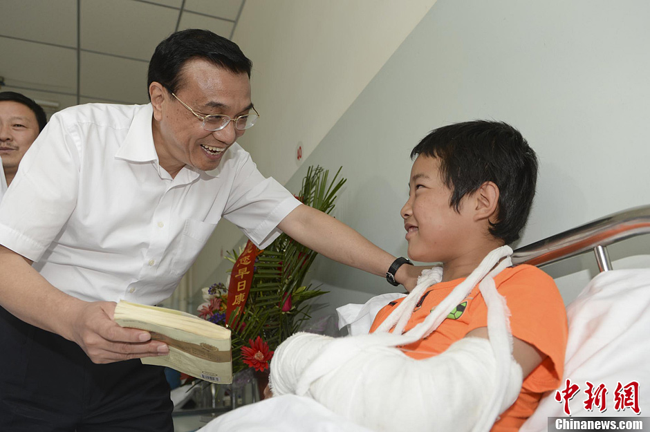 8月17日,国务院总理李克强来到岷县人民医院看望收治的地震重伤员。他对12岁的小伤员蔡健东说,好好养伤,争取尽快上学。经历了这场灾难,你会更坚强,灾难面前知识也是力量,一定要好好学习。廖攀 摄