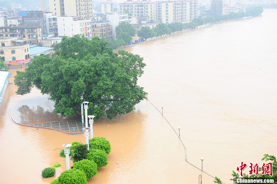 8月17日发稿时止,受强台风“尤特”影响,广东怀集遭遇50年一遇特大洪水,该县三防办指挥部表示,从8月15日8时到17日13时,该县41个雨量站分别录得降雨量100mm以上,其中最大的是冷坑三坑水库站410mm,17日13时该县三坑水库、湖朗水库、下竹水库等超防限水位,在17日11时水位已达到为53.29米,超警戒水位3.29米,暂无接到人员伤亡报告。据初步统计,该县因灾造成直接经济损失1234.36万元, 全县农作物受灾面积3.57万亩, 水产养殖面积503亩,受浸房屋232间,房屋倒塌46间(土木结构),道路塌方4处,山体滑坡1处20米,冲坏灌溉渠道676米。目前,该怀集县城绥江水位正在逐渐消退中。图为受灾县城。中新社发 黄耀辉 摄