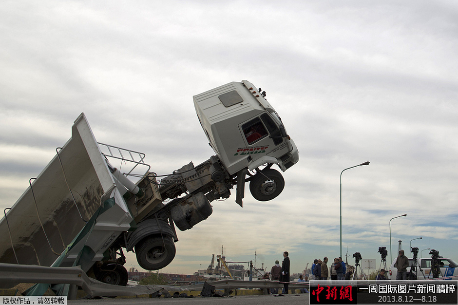8月12日(周一),布宜诺斯艾利斯,记者们聚集在一架发生交通事故的卡车周围。该卡车在撞上一辆汽车后失去控制,并最终悬停在拉普拉塔河畔(Rio de la Plata river)。目前尚无人员伤亡的报道。