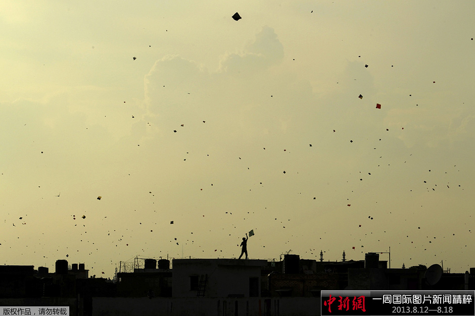 8月15日(周四),印度新德里,一名男孩在屋顶放风筝。当日为庆祝独立日印度民众开展放风筝活动。