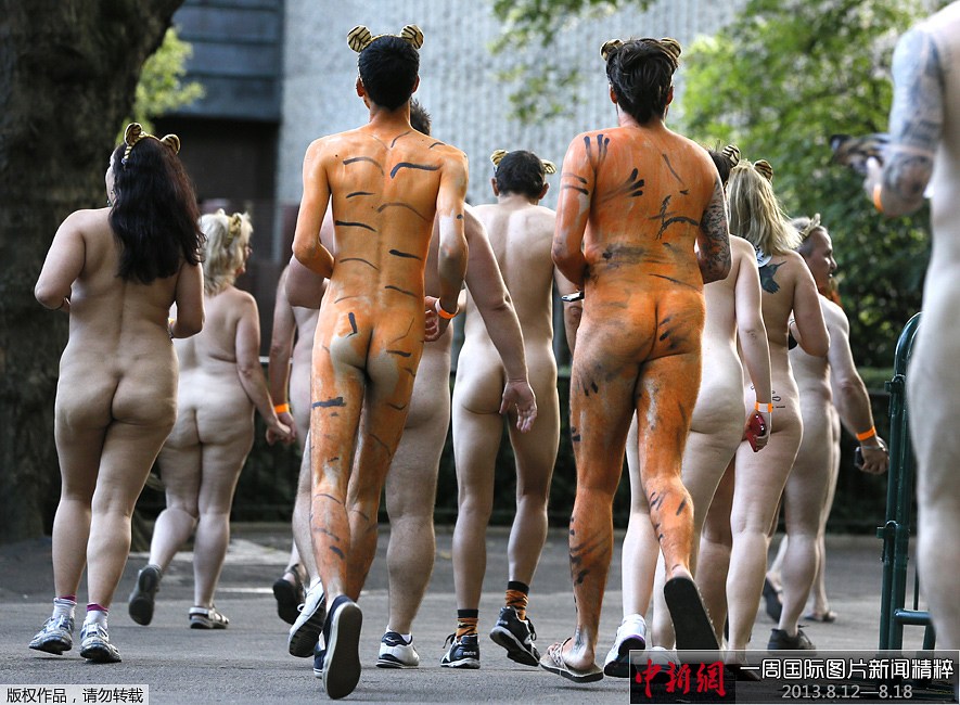 8月15日(周四),英国伦敦,300名动物保护者全裸或涂着老虎彩绘在伦敦动物园里跑步,为苏门答腊虎保育工作募集资金。目前,地球上只剩下大约300只苏门答腊虎。