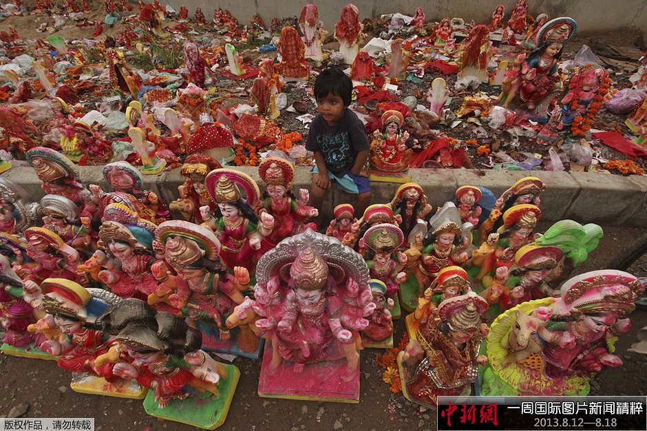 8月16日(周五),印度艾哈迈达巴德,一个年轻的孩子坐在印度教女神Dashama的偶像中。