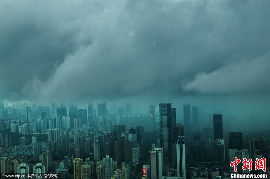 8月18日,广州深圳,强台风“尤特”虽已过去,但其带来的强降雨云团笼罩深圳上空,乌云翻滚,犹如魔幻世界。图片来源:CFP视觉中国