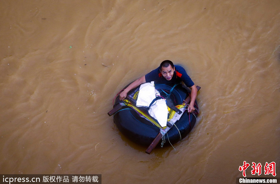 2013年8月17日,受台风“尤特”影响,广州市从化吕田镇新屋村外的河中,一位村民用轮胎当救生圈在水中行走。图片来源:东方IC 版权作品 请勿转载