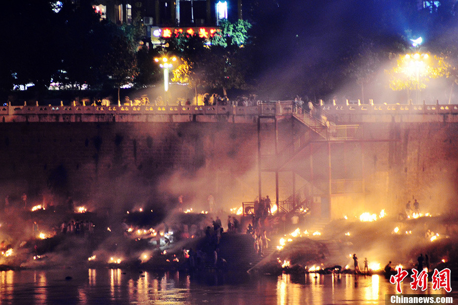 8月18日晚,农历七月十五——“七月半”前夕。四川达州民众陆陆续续到州河边烧纸钱,以祭奠先祖、缅怀先人。每年此时,达州城区州河沿江燃烧祭祀物品的火光、呛人的烟雾弥漫着整个城市。张骥 摄