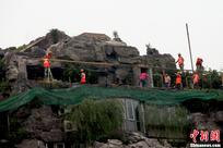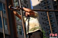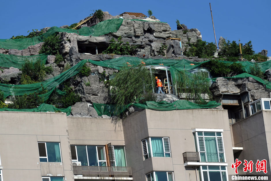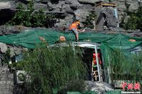 8月19日上午,北京备受关注的人济山庄“楼顶别墅”开始拆除阳光房,预计几天内将拆完,而楼下已经开始搭建的脚手架防护栏工程也已过半。当日上午8点,从外可见6名工人身着统一工作服在楼顶施工作业,另有一位便装男子不时过来指挥。在人济山庄B栋楼下,数十名工人头戴安全帽正在安装脚手架、木板等围楼防护架,目的是为了防止高空坠物可能带来的危险。图为工人正在拆除玻璃房。中新网记者 金硕 摄