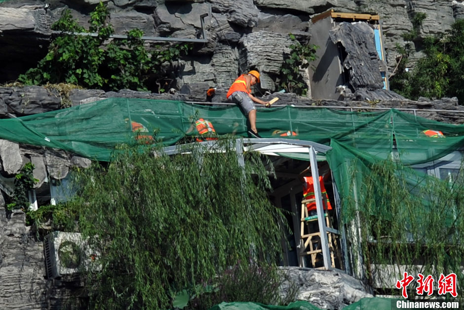8月19日上午,北京备受关注的人济山庄“楼顶别墅”开始拆除阳光房,预计几天内将拆完,而楼下已经开始搭建的脚手架防护栏工程也已过半。图为工人正在拆除玻璃房。中新网记者 金硕 摄