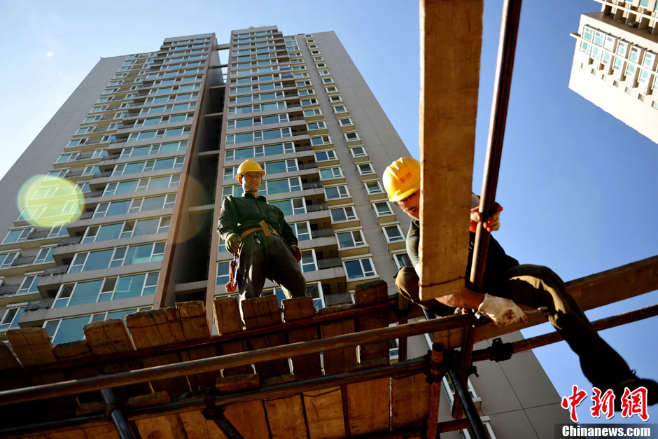 8月19日上午,北京备受关注的人济山庄“楼顶别墅”开始拆除阳光房,预计几天内将拆完,而楼下已经开始搭建的脚手架防护栏工程也已过半。图为工人在B栋楼下搭建脚手架防护栏。中新网记者 金硕 摄