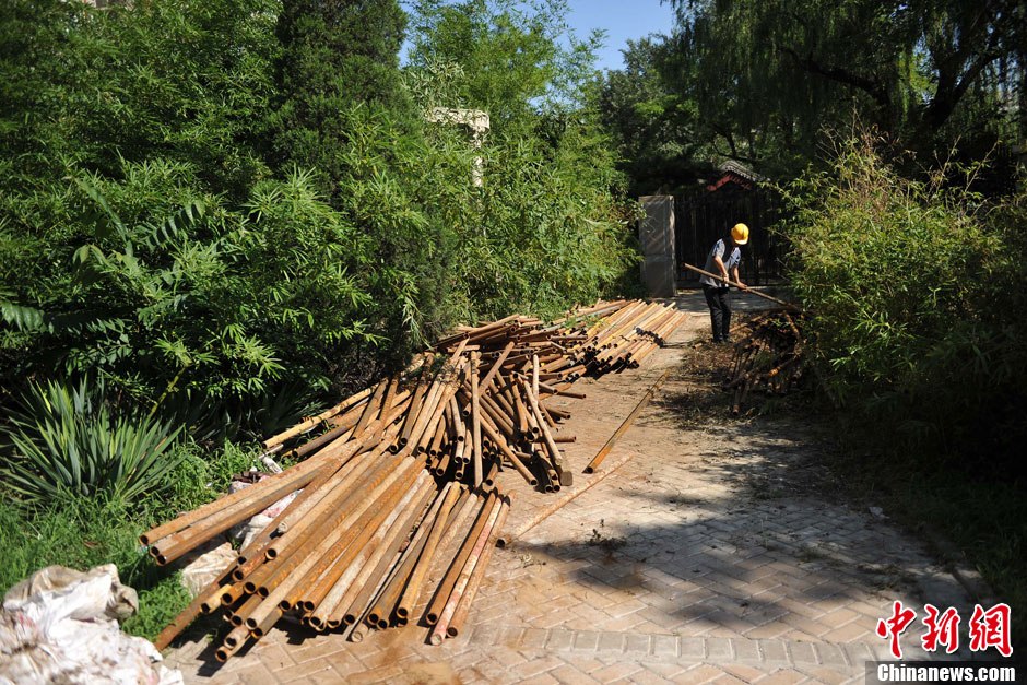 8月19日上午,北京备受关注的人济山庄“楼顶别墅”开始拆除阳光房,预计几天内将拆完,而楼下已经开始搭建的脚手架防护栏工程也已过半。图为小区堆放的脚手架钢管。中新网记者 金硕 摄