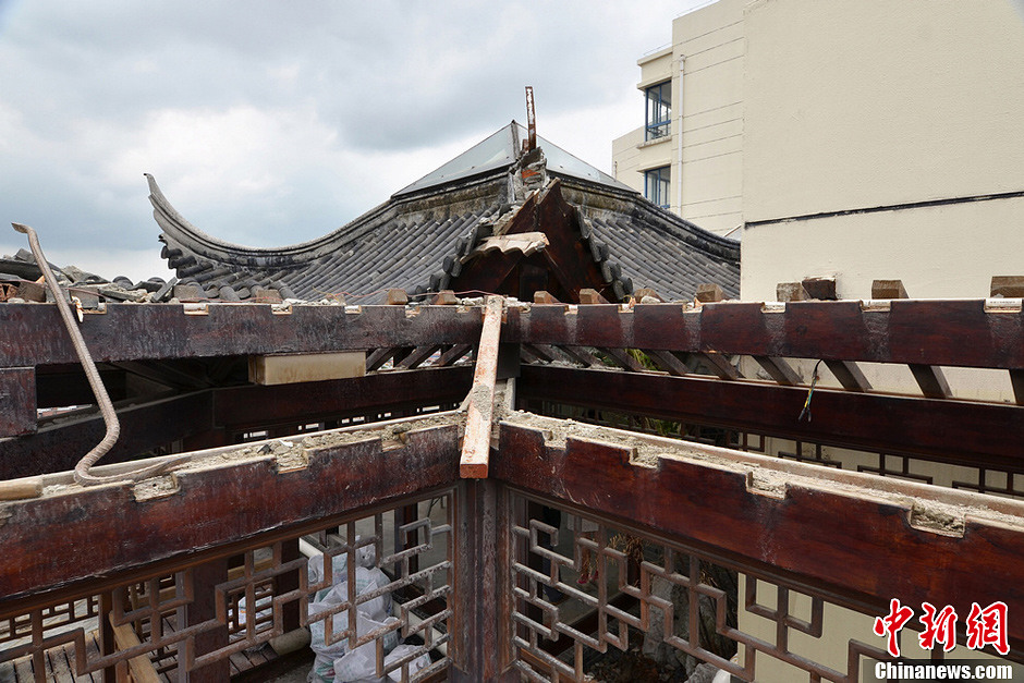 8月19日,一支施工队伍正在拆除位于江苏苏州市三香大厦高楼18层楼顶东侧阳台的“苏州园林”式违建别墅,工人们透露全部拆除至少需要一星期的时间。当日,现场一片狼藉,屋内原本有一些家具已经搬走,四周围的窗户和玻璃也拆下整齐地放在一旁,在屋外平台凉亭一角的翘角已被拆除,一旁堆砌着砖瓦,地上散落着碎石和木块。图为“园林”式违建凉亭一角的翘角已被拆除。王思哲 摄