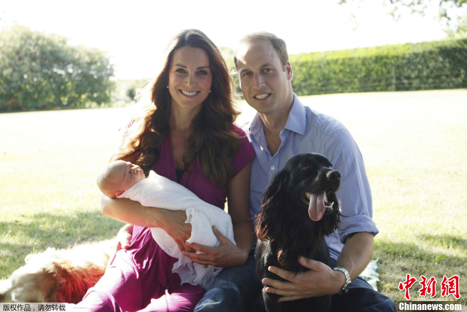 当地时间2013年8月19日,英国肯辛顿宫公布了威廉王子夫妇在巴克勒贝利拍摄的全家福照片。照片中凯特王妃抱着正在酣睡的乔治小王子,威廉王子陪伴在一旁,全家人其乐融融。