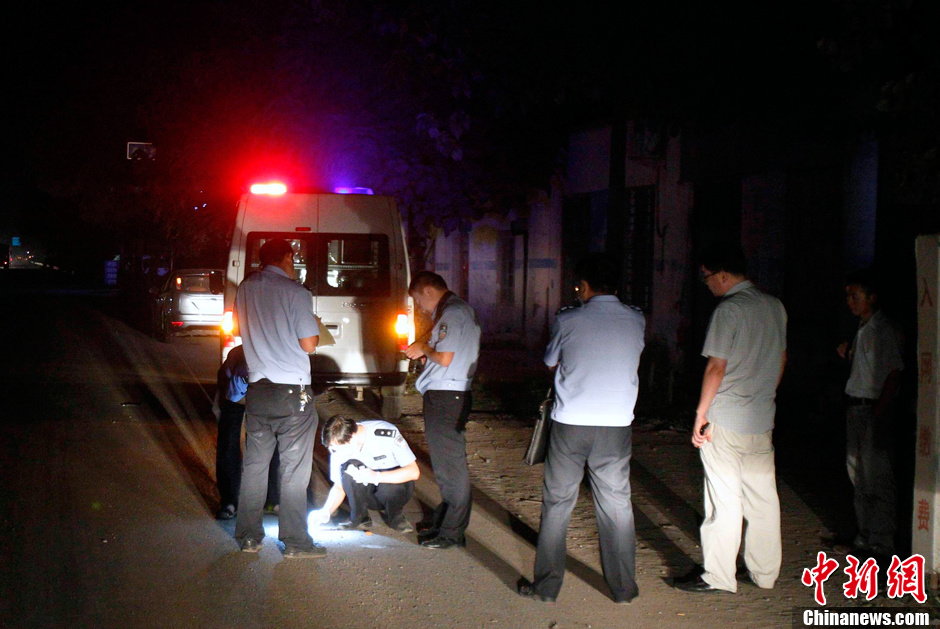 8月19日夜,警方在案发现场进行技术勘察。当日15时05分,安阳市区至安阳县北郭乡的公交车上发生一起持刀抢劫杀人案。车上共33名乘客,有15人被不同程度捅伤,其中2人在救治途中死亡,其余13人分别被送至安阳市人民医院、安阳县第二人民医院全力进行救治,截止20日凌晨,又有一名受伤人员在医院经抢救无效死亡。安阳警方已发出10万追凶悬赏通告,并启动命案侦破机制,动用400余名警力正全力围捕嫌疑人。中新社发 王中举 摄