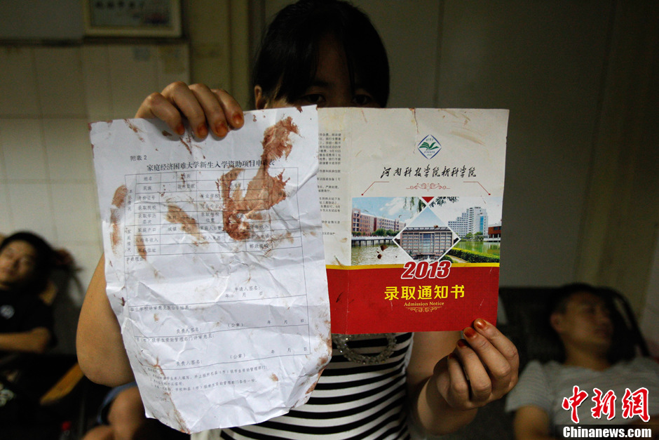 8月19日夜,受害者王园园的姑姑在医院重症监护室门前拿出侄女带血的大学录取通知书,而满身是血的侄女还正在重症监护室里抢救。据王园园的姑姑介绍,王园园是在去拿录取通知书回家的路上乘坐了这趟公交车。当日15时05分,安阳市区至安阳县北郭乡的公交车上发生一起持刀抢劫杀人案,目前已致3死12伤。中新社发 王中举 摄