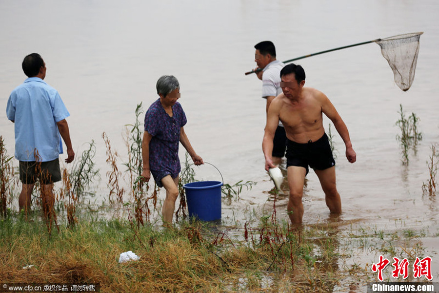 8月20日,湖南株洲白石港、湘潭马家河、湘潭二大桥下陆续发现死鱼。对此,株洲市环保局微博作出回应,称衡阳市和省环保厅正在排查,不能肯定是否人为投毒。在发现死鱼的株洲、湘潭等地,沿岸居民获知消息纷纷前往死鱼地点捞鱼。彭健江 摄 图片来源:CFP视觉中国