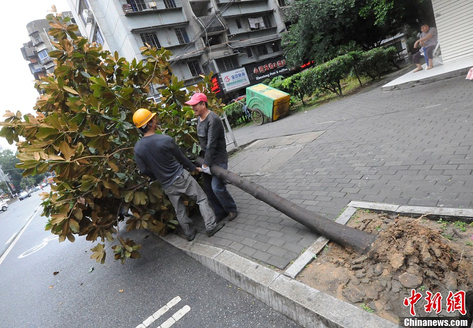 8月22日上午,福州园林部门工作人员在福州市区达明路上将一棵被台风“潭美”刮倒的行道树扶正准备重新种植。当日凌晨,今年第12号台风“潭美”来袭,福州刮起大风携带大雨,市区多条街道的不少行道树被刮倒。中新社发 刘可耕 摄