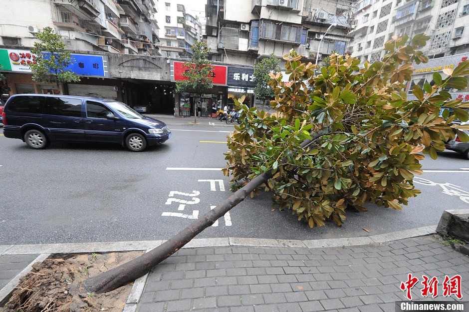 8月22日上午,在福州市区湖东路、达明路、北大路等路段,不少被台风“潭美”连根拔起的行道树横卧在路边。福州市园林部门工作人员正抓紧清理或将被台风刮倒的行道树重新扶正种植。当日凌晨,今年第12号台风“潭美”来袭,福州刮起大风携带大雨,市区多条街道的不少行道树被刮倒。刘可耕 摄