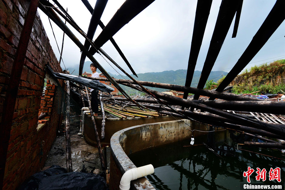 8月22日,福建宁德三都澳家溪村海产品养殖户清理重建被台风“潭美”吹毁的近千平方米厂房。当日凌晨,今年第12号台风“潭美”在福建登陆,登陆时,恰逢天文大潮期,风、雨、潮三碰头,对福建沿海地区产生了严重影响。张斌 摄