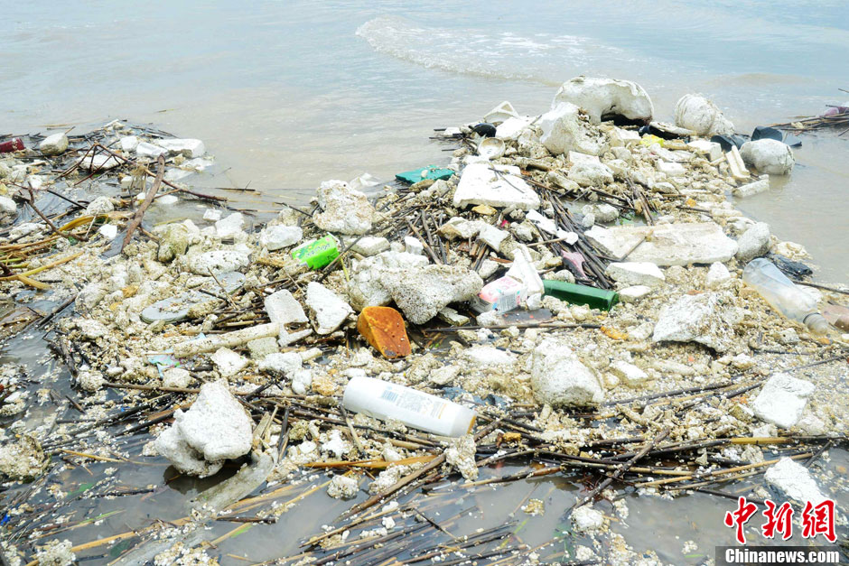 “潭美”过后 福建宁德三都澳海岸白色垃圾成堆