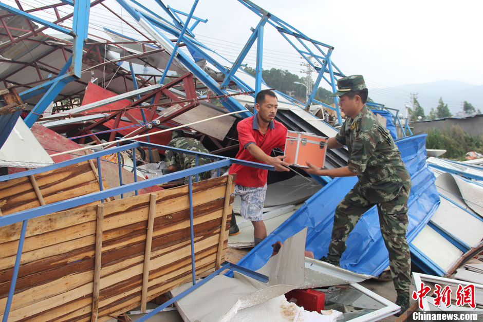 8月22日凌晨,今年第12号台风“潭美”台风福清登陆后,福清出现大范围的狂风暴雨天气,整排树被狂风吹倒,沿海地带一些简易房不同程度受损,个别村居出现不同程度的积水。当日,福清市公安边防大队出动140余人次的警力,帮助群众修缮受损房屋7座、船只29艘,转移被水围困的群众15名,清理倒地树木80余棵,并对9处地质灾害危险地带进行巡逻查看,防止发生次生灾害。图为福清城头镇一处倒塌的简易房,当地边防官兵帮助群众寻找和转移被埋的贵重物品。连仁良 摄