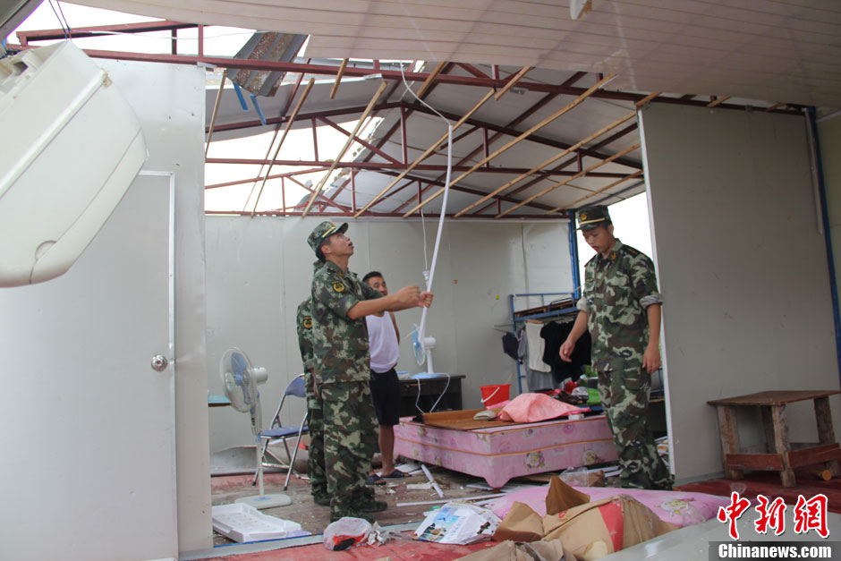 8月22日凌晨,今年第12号台风“潭美”台风福清登陆后,福清出现大范围的狂风暴雨天气,整排树被狂风吹倒,沿海地带一些简易房不同程度受损,个别村居出现不同程度的积水。当日,福清市公安边防大队出动140余人次的警力,帮助群众修缮受损房屋7座、船只29艘,转移被水围困的群众15名,清理倒地树木80余棵,并对9处地质灾害危险地带进行巡逻查看,防止发生次生灾害。图为福清城头镇一处倒塌的简易房,当地边防官兵向群众了解受损情况。连仁良 摄