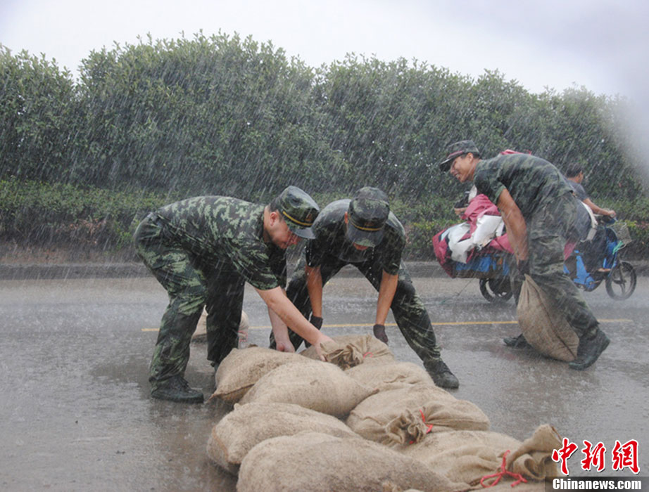 “潭美”来袭 台州边防官兵抢堆沙袋防海水倒灌