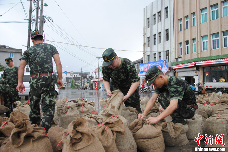 “潭美”来袭 台州边防官兵抢堆沙袋防海水倒灌
