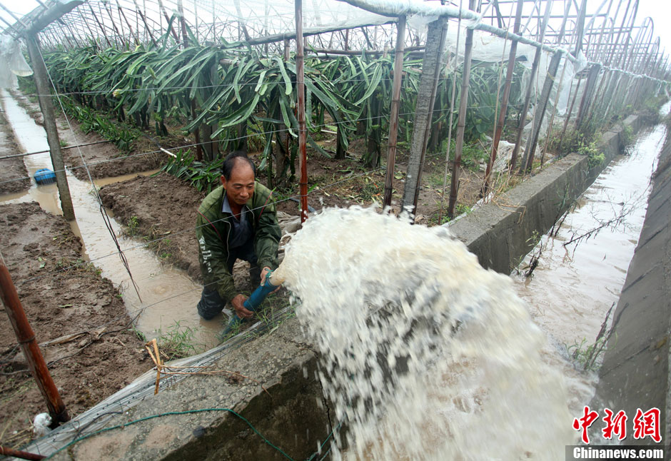 8月22日,浙江省台州市温岭市滨海镇东楼村果农林亨宗用抽水泵给受淹的火龙果园排水。当日,台风“潭美”带来强降雨,使当地部分作物受淹,农民展开生产自救,把损失降到最低。中新社发 周学军 摄