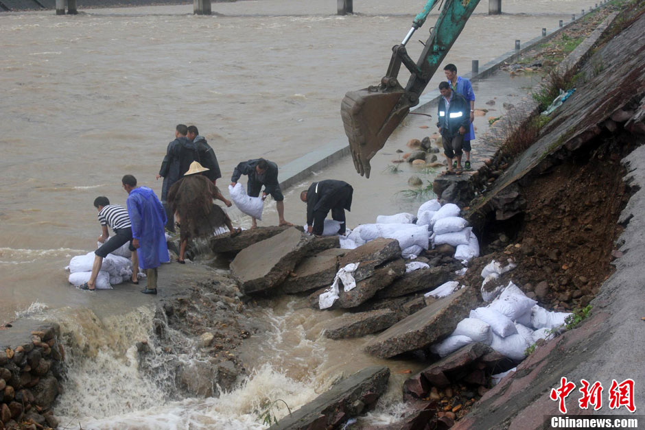 8月22日,受台风“潭美”影响,浙江省台州市临海市括苍镇马横溪堤坝出现缺口。经抢修,目前险情已排除。中新社发 陈平 摄