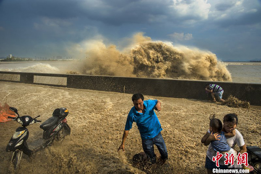 钱江潮接连发威 巨浪拍岸吓跑游客