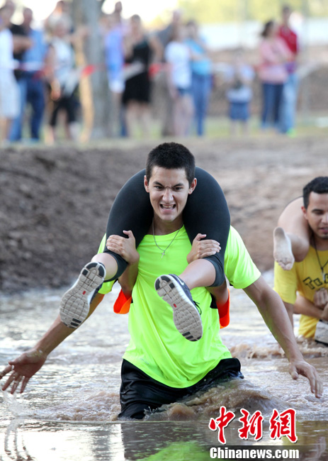 当地时间8月24日,“背老婆”大赛参赛选手正穿越水洼障碍。当天,2013年得克萨斯州“背老婆”大赛在里奇蒙德举行,共有30对夫妻或男女朋友组合参与角逐。选手们必须背着体重49公斤以上的“老婆”在253.5米的场地内先后穿越沙、草地,2个干地障碍和1个水洼障碍,先到达终点者即为优胜。去年的冠军凯文组合今年依旧发挥出色,以1分12秒的最快成绩成功卫冕,得到500美元奖金。中新社发 王欢 摄