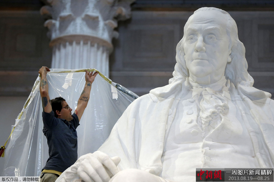 8月20日,费城的富兰克林博物馆内,一名工作人员将本杰明·富兰克林(Benjamin Franklin)的雕像盖住,为施工做准备。该博物馆计划将此雕像与新建的“尼古拉斯与雅典娜·卡拉波茨之亭”(Nicholas and Athena Karabots Pavilion)连接起来。这对夫妇向馆方赠送了价值1,000万美元的礼物。