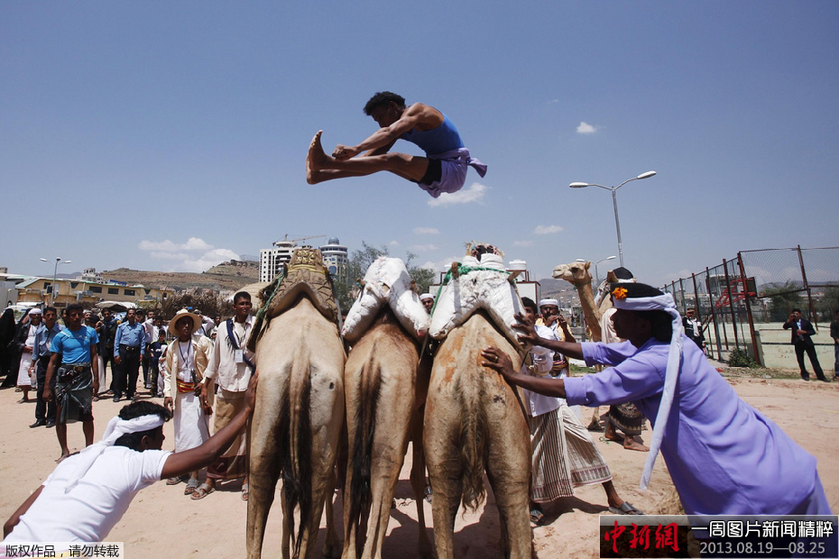8月19日,也门萨那的庆祝活动上,一名贝都因族男子腾空跳过并排站立的三头骆驼。此次庆祝活动旨在刺激国内旅游业并向人们深化“也门局势稳定”这一理念。
