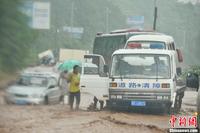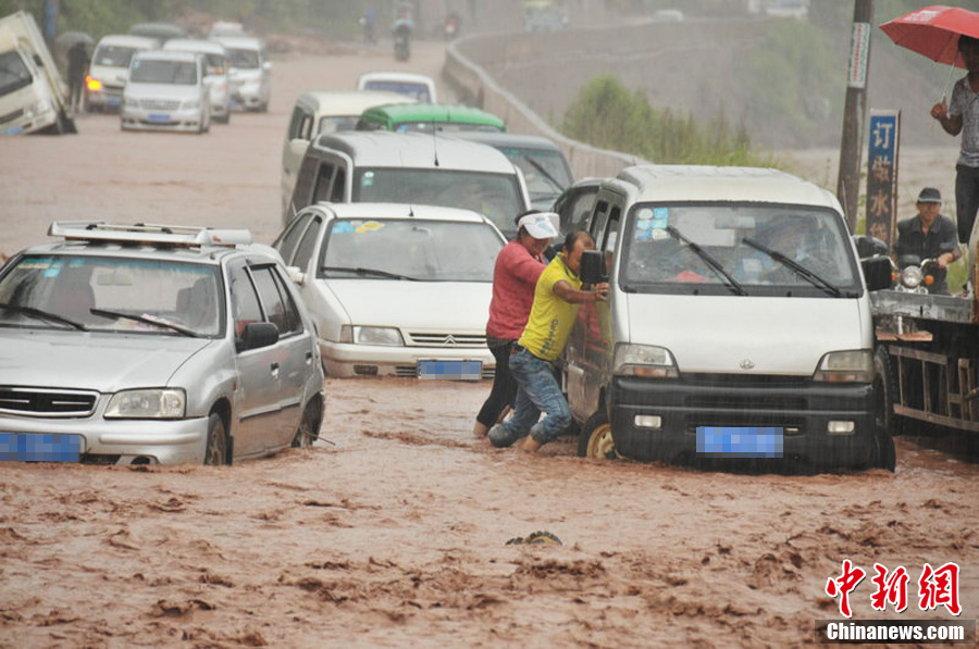 8月25日下午,云南彝良县城朱家沙坝处因暴雨引发山洪和泥石流灾害,公路上洪水和淤泥已可淹没轿车车轮,部分车辆通过此路段时陷入淤泥中而无法动弹,过往车主和行人协力推着抛锚车辆前行。