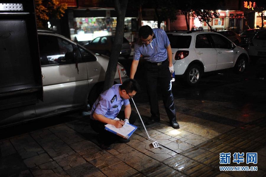 8月25日,警方在一处现场取证。记者从政府相关部门了解到,25日晚9时左右,成都发生一起严重治安事件,一名犯罪嫌疑人在北一环路府青立交附近到曹家巷的路上,一路持刀伤人。目前犯罪嫌疑人被警方抓捕,具体伤亡人数正在统计中。据网友爆料,犯罪嫌疑人共对10余人行凶。新华社发 薛玉斌 摄 图片来源:新华网