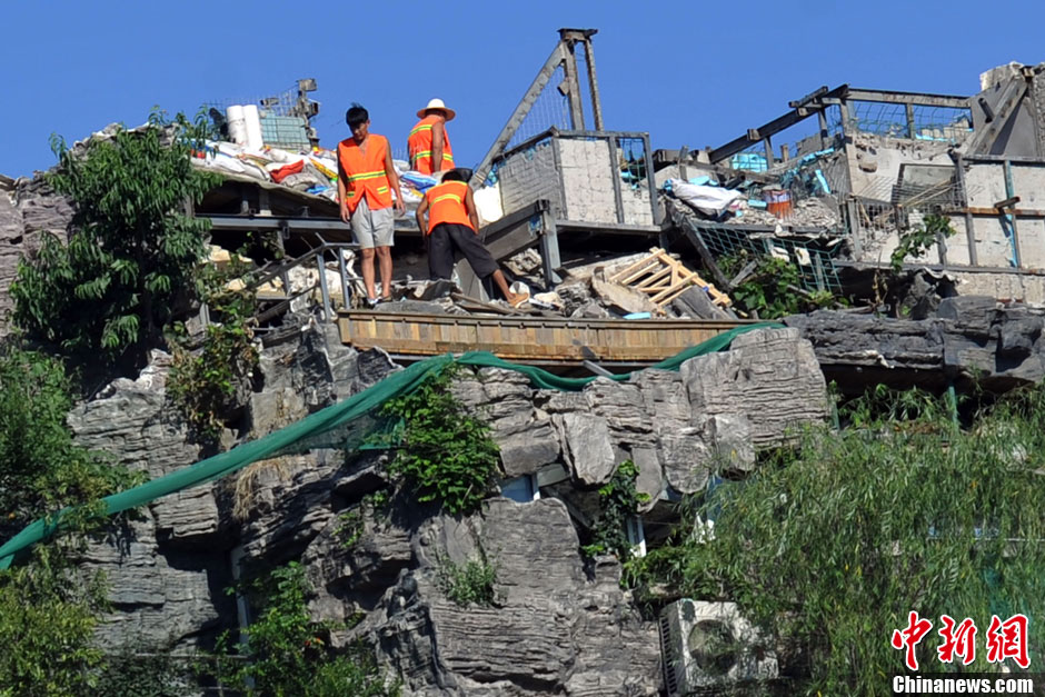 8月26日上午,北京人济山庄的“最牛违建”15天限拆日期已到,目前楼顶工人仍在继续施工,较此前楼顶假山已拆除五分之一。当日上午8点起,约有6名工人仍在违建的东侧屋顶上搬运着移除的假山。据北京市海淀区城管执法队介绍,由于张必清在15日内已开始自行对违建进行了拆除工作,目前城管执法队不会对其进行强拆。中新网记者 金硕 摄