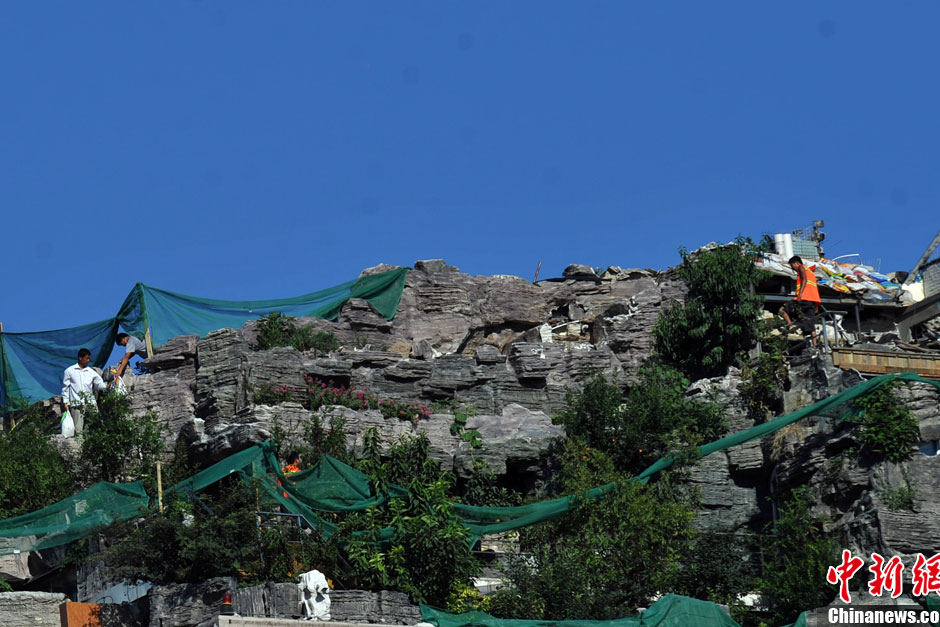 8月26日上午,北京人济山庄的“最牛违建”15天限拆日期已到,目前楼顶工人仍在继续施工,较此前楼顶假山已拆除五分之一。当日上午8点起,约有6名工人仍在违建的东侧屋顶上搬运着移除的假山。据北京市海淀区城管执法队介绍,由于张必清在15日内已开始自行对违建进行了拆除工作,目前城管执法队不会对其进行强拆。中新网记者 金硕 摄