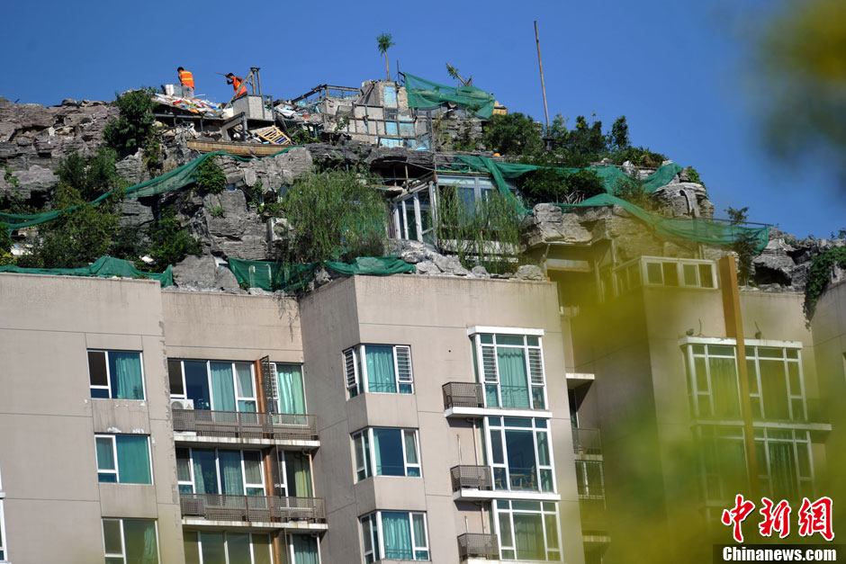 8月26日上午,北京人济山庄的“最牛违建”15天限拆日期已到,目前楼顶工人仍在继续施工,较此前楼顶假山已拆除五分之一。当日上午8点起,约有6名工人仍在违建的东侧屋顶上搬运着移除的假山。据北京市海淀区城管执法队介绍,由于张必清在15日内已开始自行对违建进行了拆除工作,目前城管执法队不会对其进行强拆。中新网记者 金硕 摄