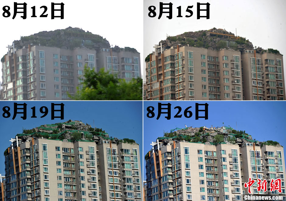 图为拼版图片。左上:为8月12日拍摄的“楼顶别墅”;右上为8月15日拍摄的“楼顶别墅”;左下为8月19日拆除现场的照片;右下为8月26日,拆除半个月后的“花果山”。中新网记者 金硕 摄