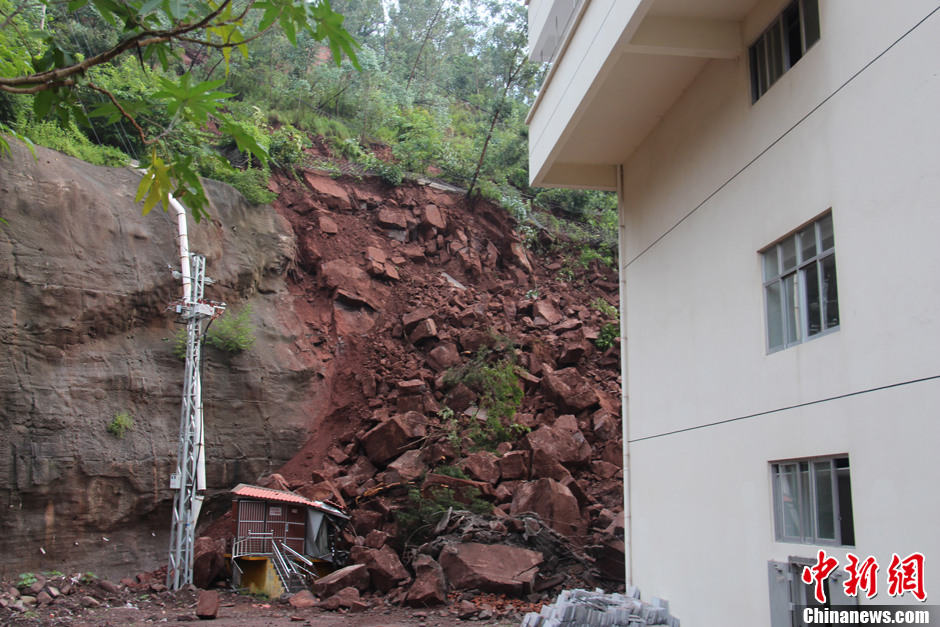 8月26日凌晨,云南省彝良县人民医院新住院大楼后面的山体发生滑坡灾害,虽无人员伤亡,但对住院大楼内的病人生命安全造成威胁。图为因滑坡滚落的山石。龙娇 摄