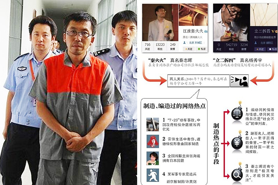 20日,公安部宣布,北京警方打掉一个网络推手公司--北京尔玛互动营销策划有限公司,“秦火火”是该公司前员工之一。同时被刑拘的还有尔玛公司负责人“立二拆四”(真名杨秀宇)。通过二人讲述和办案民警介绍,“网络大谣”们以谣博名、以谣牟利的灰色网络利益链得以暴露在阳光之下。图片来源:新华网