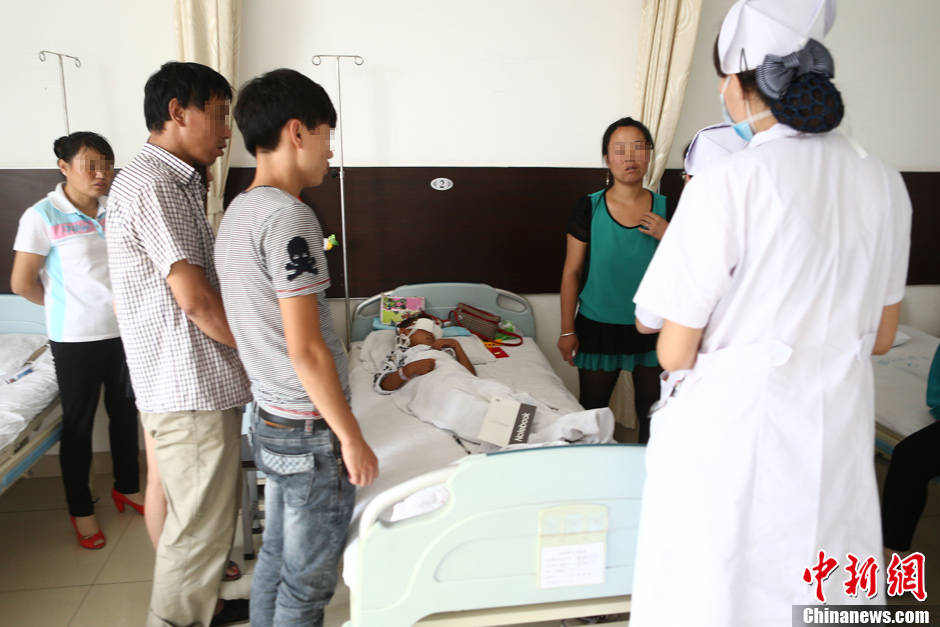 8月27日,山西6岁男童被骗挖去双眼一事成为舆论焦点,男童入住的山西省眼科医院四楼病房门口有医院保安把守,医护人员和家属不停穿梭其中。据医院办公室主任杨彩珍介绍,目前,经过院方全力抢救,男童已无生命危险,但基本确定已经失明,下一次具体的手术时间还未确定。当日中午,山西省临汾市公安局表示要全力侦破该案件,尽快将犯罪嫌疑人绳之以法。据男孩父母介绍,8月24日晚上10时许,在离家不远的野地里发现满脸鲜血、眼珠已被挖去的小男孩,但眼角膜已不见。当地警方已在事发现场找到男孩的眼珠。据孩子自己描述,嫌疑人疑似一名操外地口音妇女。图为护士前来查房。张云 摄