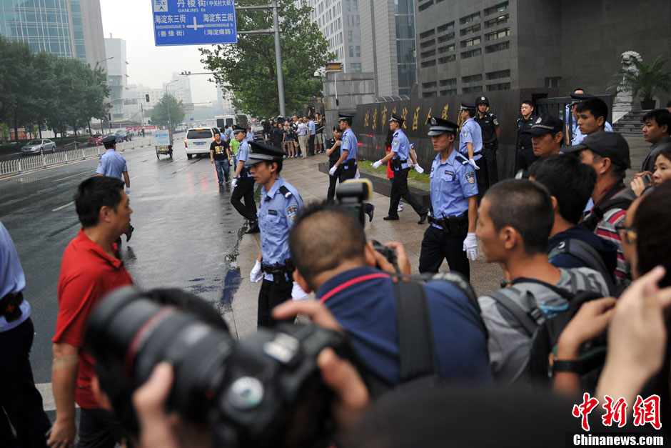 8月28日上午,李某某等人涉嫌强奸案在北京海淀法院开庭。大批媒体赶到海淀法院“蹲守”,同时,大量民警在法院外维持秩序,李某某乘坐的车辆在警察的包围下迅速开进法院。中新网记者 金硕 摄
