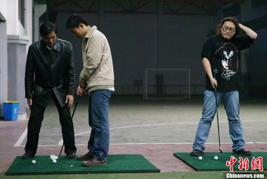 2005年11月24日,上海财经大学,学生们正在练习高尔夫球击球姿势。高尔夫球课成为该校的一门选修课程,在上海是首家。图片来源:CFP视觉中国