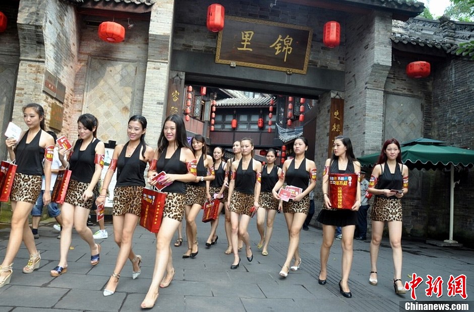 8月28日,40名身着豹纹露背短裙装的性感“豹女郎”提着公德移动垃圾桶亮相成都锦里,在锦里古街进行了“不怕热,不怕苦,公德就学阿不叔”公德接力活动。中新社发 林峰 摄