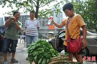 8月28日,重庆一小男孩正在为顾客称菜。重庆沙坪坝区12岁小男孩利用闲暇日帮助父母卖菜补贴家用。据悉,该小男孩已经在此摆摊已经长达3年时间。动作娴熟的称菜收钱做生意,不少附近的居民都成为了他的老顾客。陈超 摄