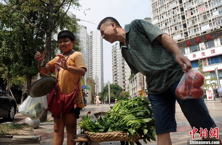 8月28日,重庆一小男孩正在为顾客称菜。重庆沙坪坝区12岁小男孩利用闲暇日帮助父母卖菜补贴家用。据悉,该小男孩已经在此摆摊已经长达3年时间。动作娴熟的称菜收钱做生意,不少附近的居民都成为了他的老顾客。陈超 摄